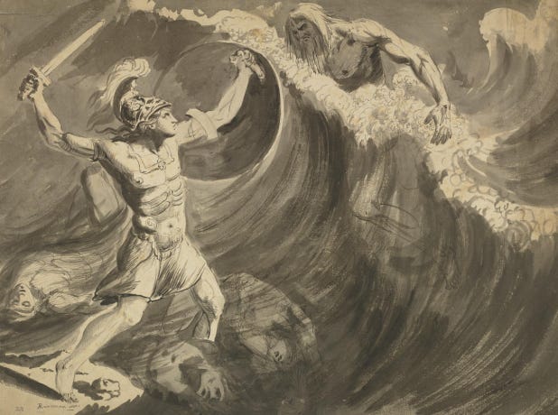 In the Iliad, the hero Achilles, fights Skamander, the god of the river of Troy. Skamander rises against “the best of the Achaeans” and engulfs him with the sweeping force of his waves pressing on all sides. The brave hero cannot resist the onslaught of the divine river and attempts to run, gripped by fear. Helpless, he imagines himself dying an unheroic death by water (rather than a heroic one by combat) and implores Zeus for help. Poseidon and Athena come to the rescue and Hera, wife of Zeus, sends her son Hephaestus to attack the river with fire while she fans the flames with the winds. Hephaestus’ fire prevails over water as it burns the trees on the banks and boils the fish in the river. Skamander is forced to yield to the will of Zeus, which is the fall of his city, Troy. (more on this myth soon in another post)